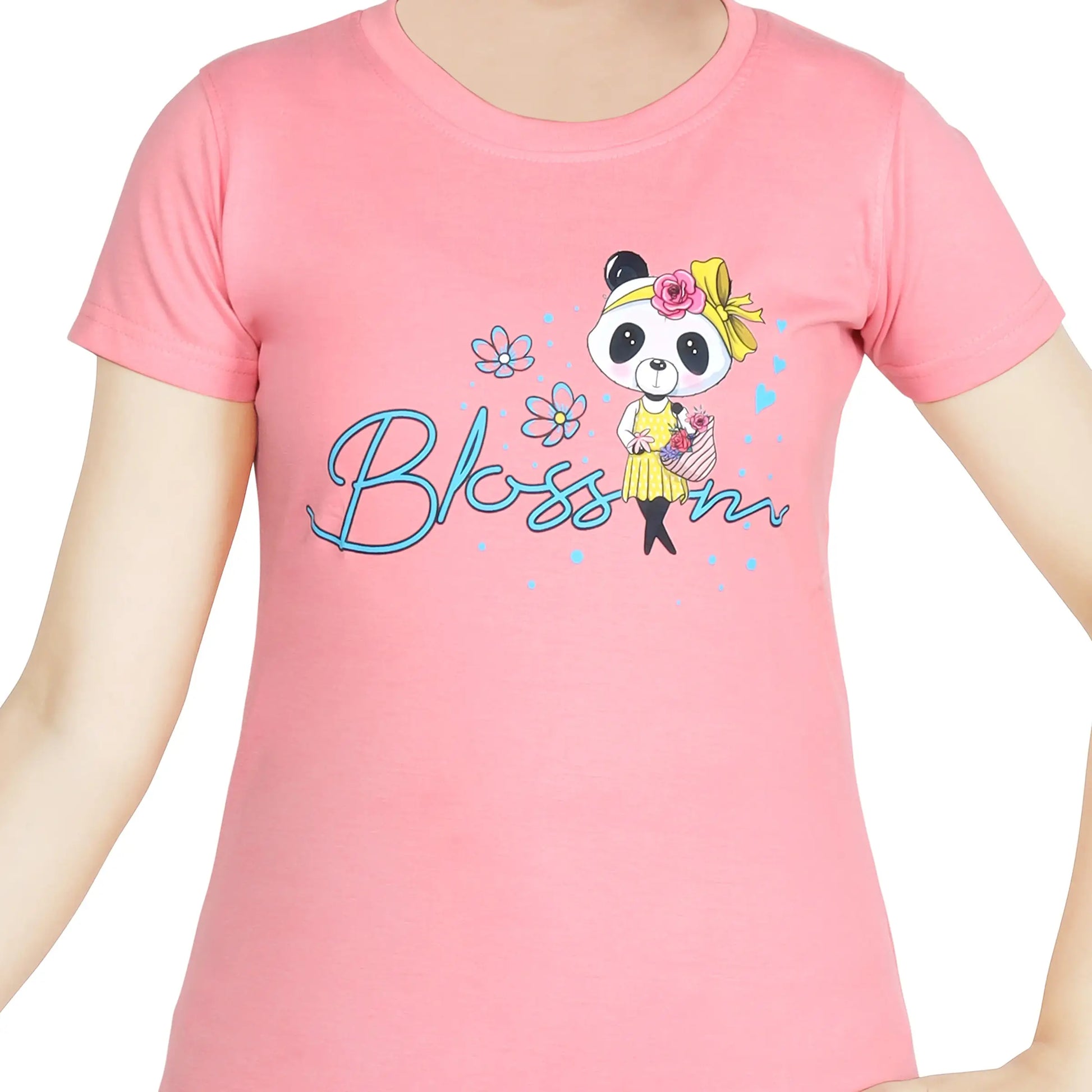 Brighten up your little girl's wardrobe with this adorable Blossom Panda Print Cotton T-shirt. Designed for style and comfort, this short-sleeve tee features a cheerful panda character dressed in a yellow outfit, surrounded by floral details and sweet heart accents. The word “Blossom” adds a touch of charm, encouraging a positive and blooming vibe. Made from soft, breathable cotton fabric, it ensures all-day comfort whether she’s at play, attending a birthday party, or out on a casual day. The classic crew neckline and comfortable fit make it easy to pair with jeans, leggings, or skirts. Lightweight and easy to wash, it’s perfect for everyday adventures and special moments alike.